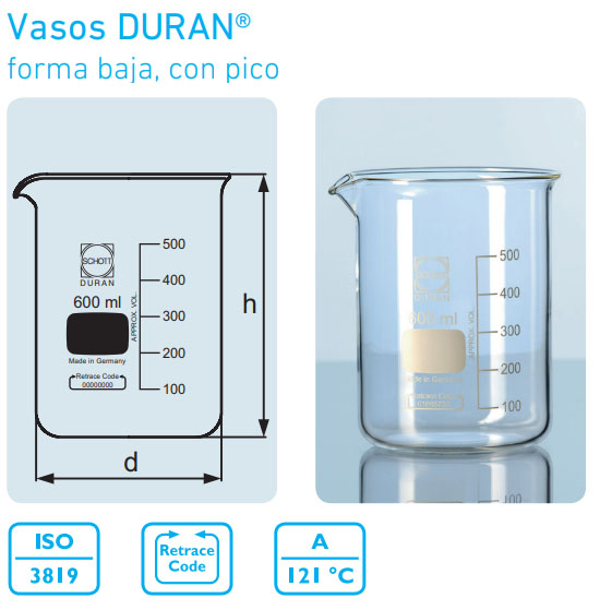 Vaso de precipitado vidrio, forma baja graduado x 50 ml. Altura 60 mm, diametro 42 mm.